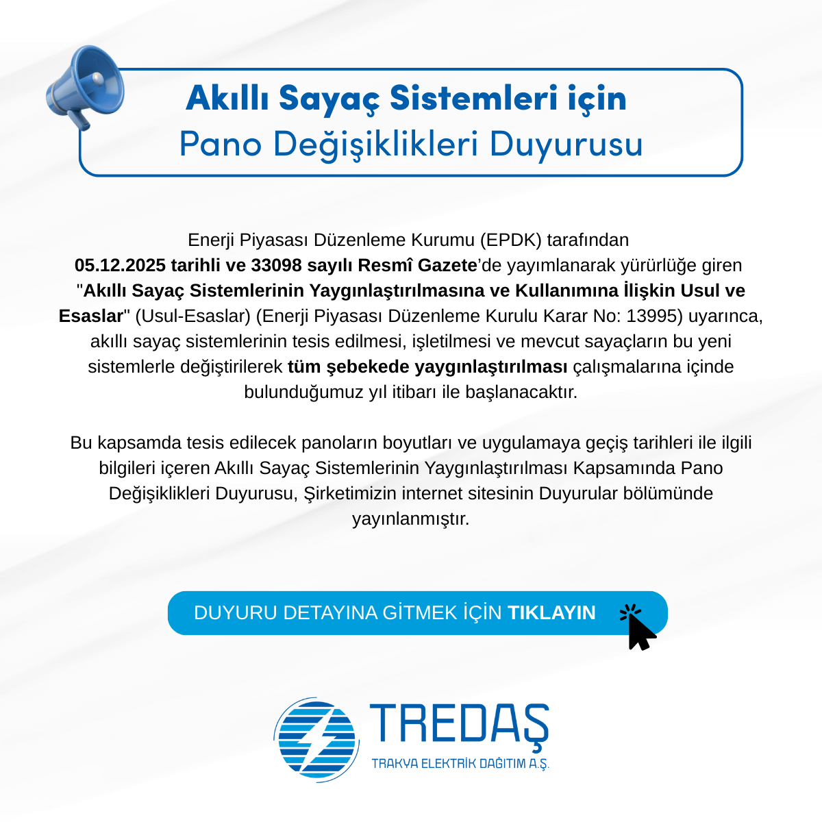 Enerji Piyasası Düzenleme Kurumu (EPDK) tarafından 05.12.2025 tarihli ve 33098 sayılı Resmî Gazete’de yayımlanarak yürürlüğe giren "Akıllı Sayaç Sistemlerinin Yaygınlaştırılmasına…