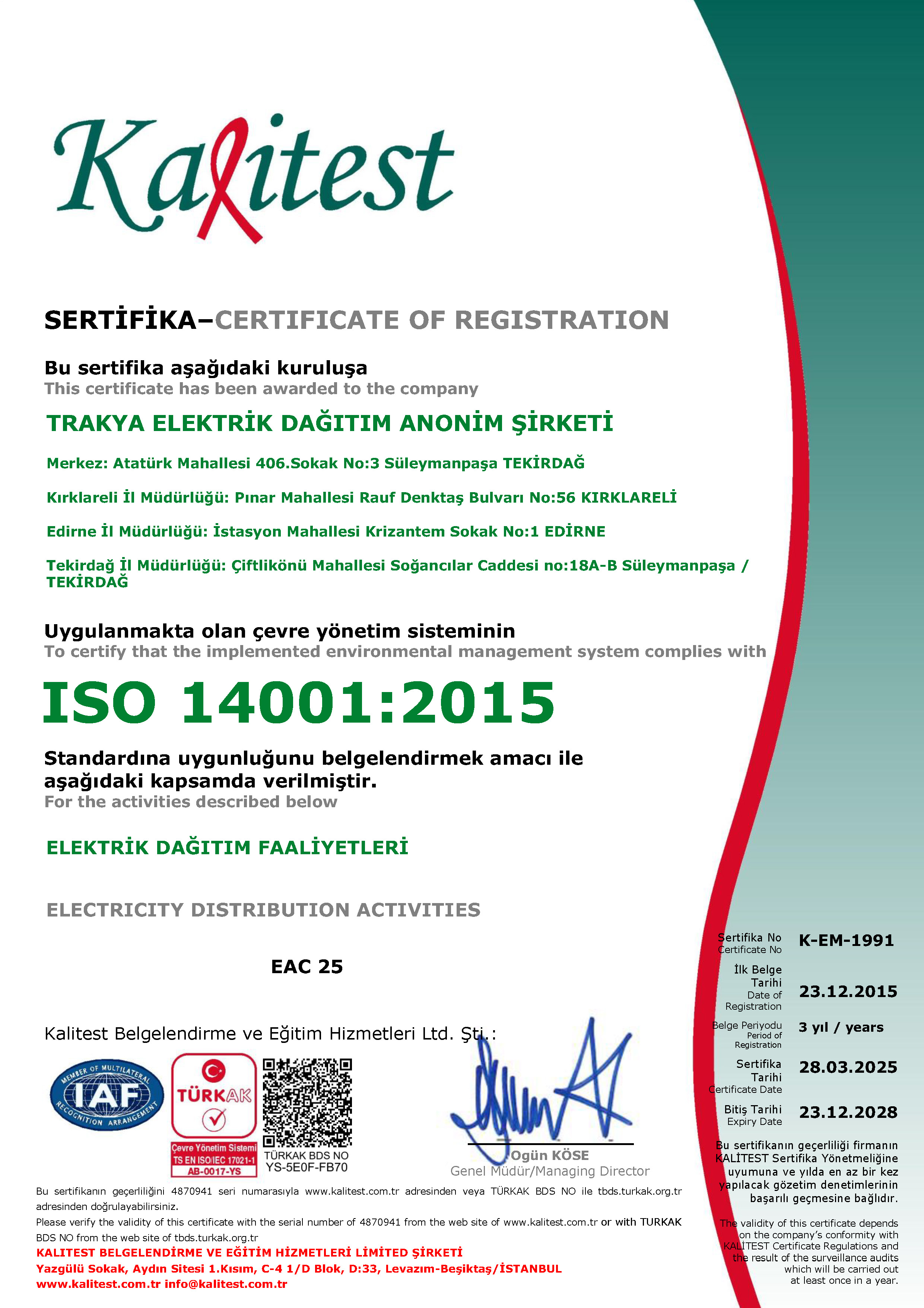 Trakya Elektrik Dağıtım A.Ş. olarak; Ulusal ve Uluslararası yasal mevzuatlar ve Yönetim Sistemleri Standartları doğrultusunda;